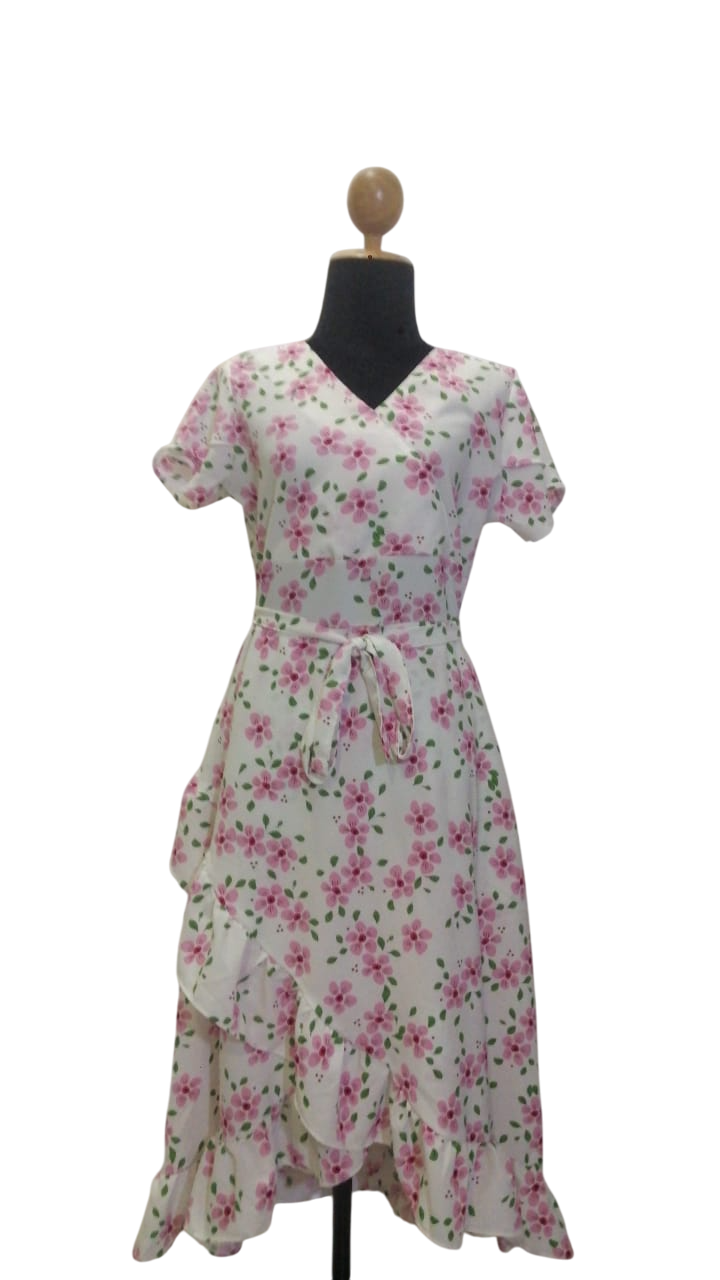 This charming floral midi dress features pink blossoms on a white base. Perfect for spring and summer, it offers a flattering fit with a ruffled hem.
