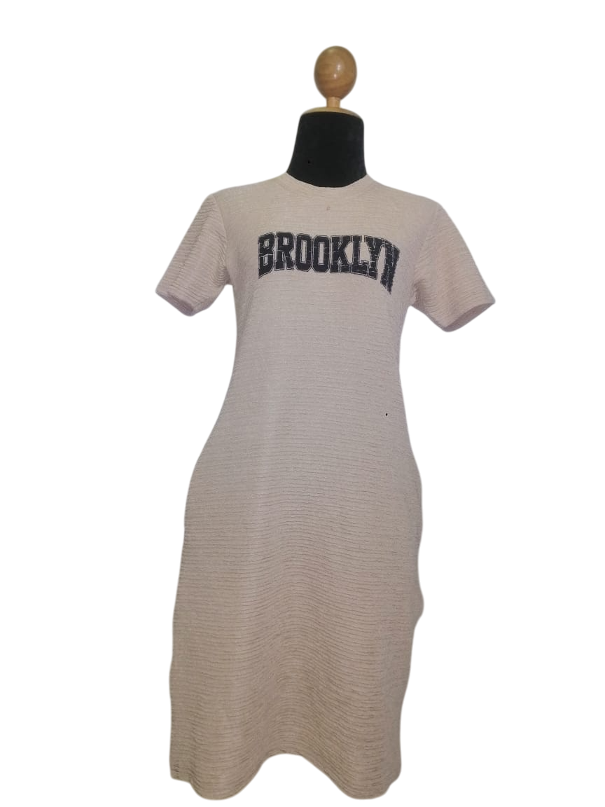Beige Brooklyn print t-shirt dress with a relaxed fit, ideal for casual wearBrooklyn Vibes Midi Dress