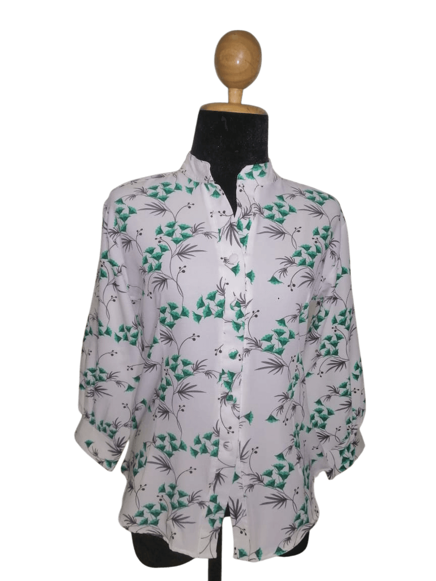 The Floral Harmony Chinese Collar Blouse is a beautifully designed top that merges classic elegance with a modern floral pattern. Featuring a sleek Chinese collar and a button-down front, this blouse creates a polished, refined look, while the delicate green and black floral print adds a touch of natural beauty.