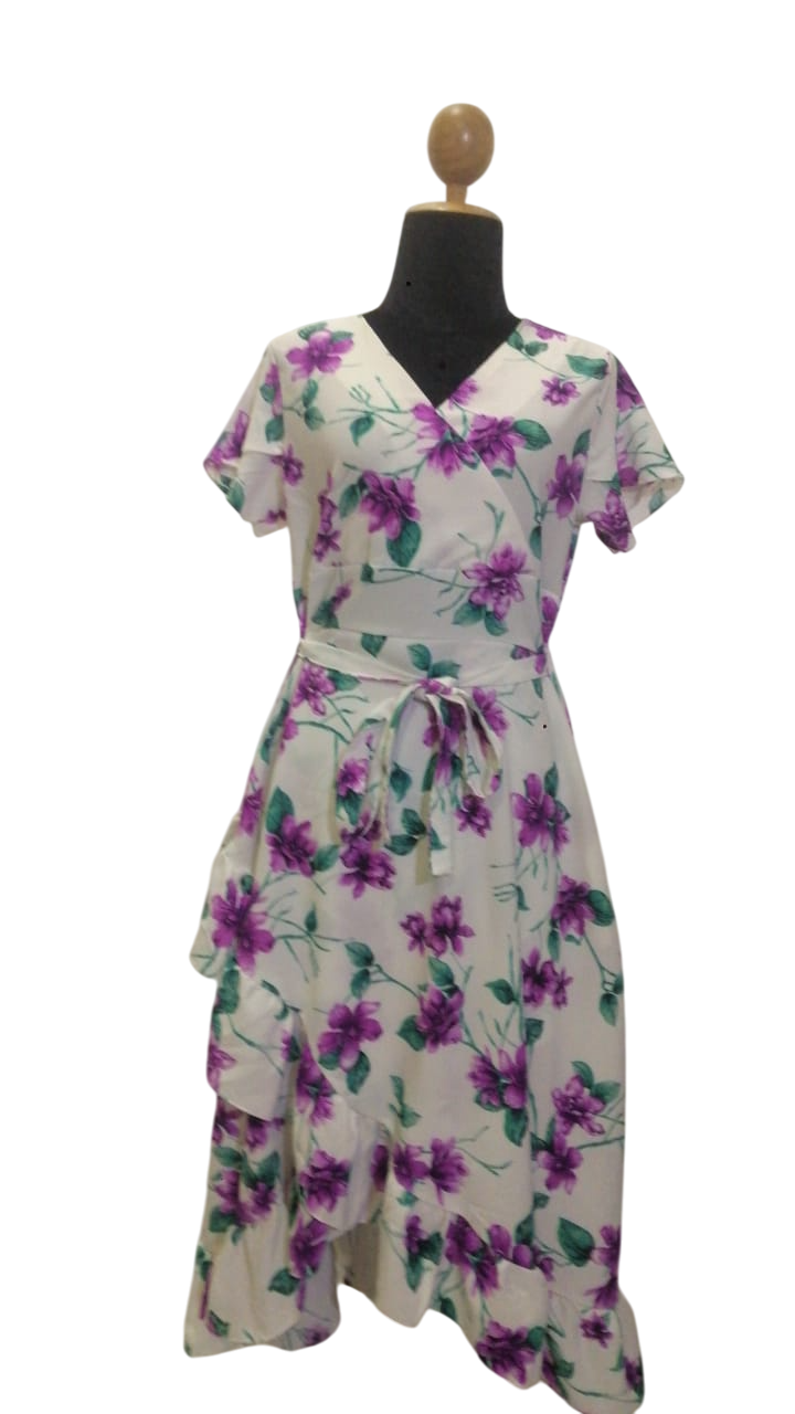 Embrace the beauty of floral prints with this stunning white floral midi dress, featuring rich purple blooms. Designed with a wrap-around style and a ruffled hem, this dress flatters every body type while providing a comfortable, breathable fit for warm days. The lightweight fabric is perfect for spring and summer, making it the perfect choice for garden parties, brunches, or a day out with friends. The waist tie adds a personalized fit, ensuring you look as good as you feel.