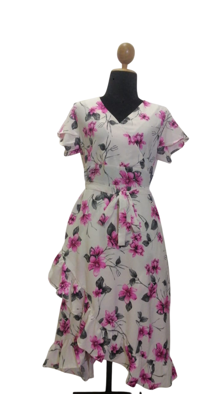 Add a touch of elegance to your wardrobe with this beautiful floral midi dress. The white fabric adorned with delicate pink flowers creates a timeless, feminine look. Designed with a wrap-around style, this dress offers a flattering silhouette, while the ruffled hem adds a playful twist. The lightweight and breathable fabric is perfect for warmer days, making it an ideal choice for casual brunches, garden parties, or semi-formal gatherings. A waist tie ensures a personalized fit for added comfort.