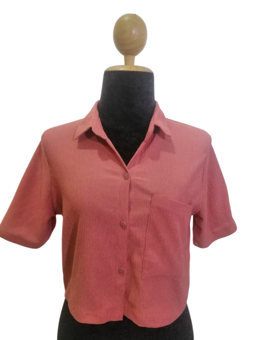 Add a pop of color and effortless style to your wardrobe with the Rosy Breeze Buttoned Crop Top. This charming cropped shirt is designed with a classic collar, a button-up front, and a functional left-side pocket, offering a subtle yet stylish twist on a casual favorite. The warm rosy hue adds a soft, feminine touch, perfect for pairing with high-waisted jeans, skirts, or shorts.
